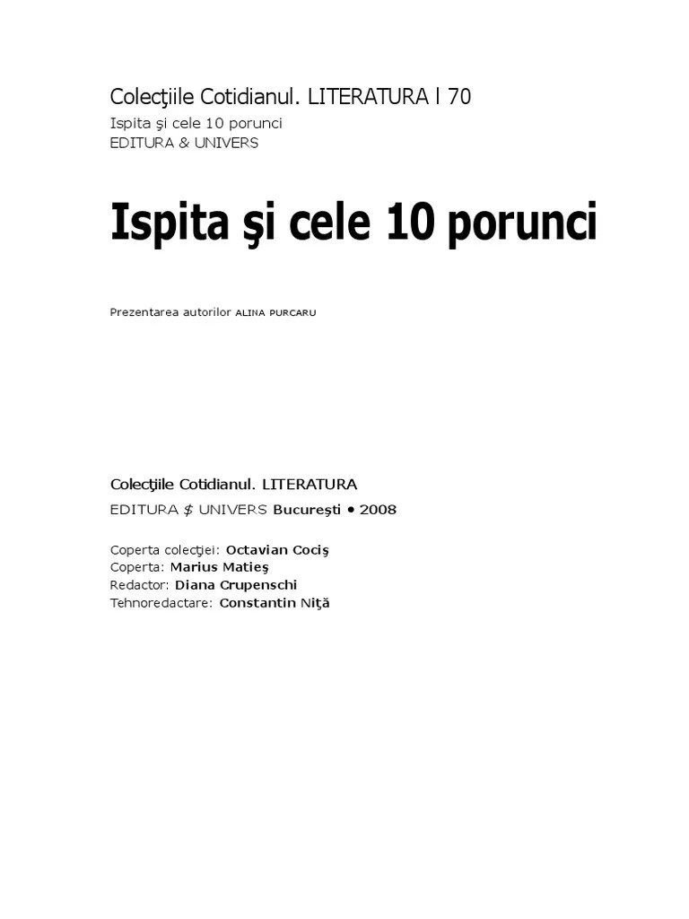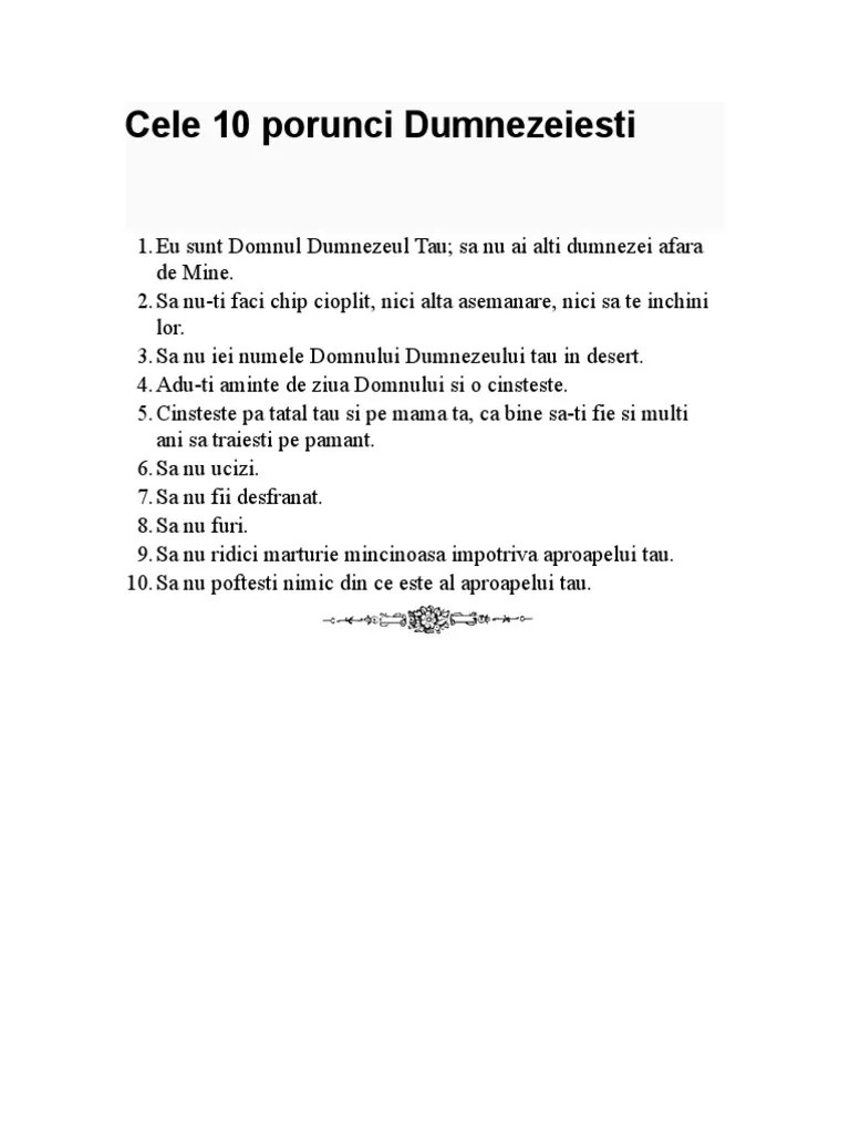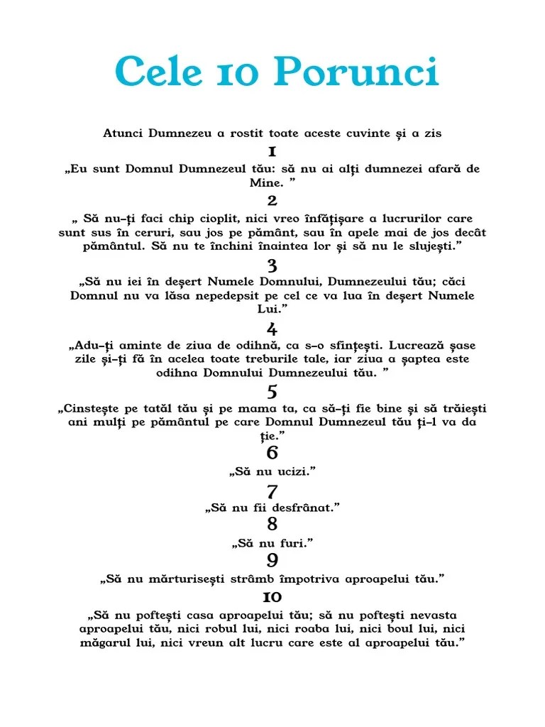 Atunci dumnezeu a rostit toate aceste cuvinte şi a zis: In esenta, cele 10 porunci reprezinta sumarul a 600 de porunci continute in legea vechiul testament. Legea lui dumnezeu este cuprinsă în cele zece porunci. Potrivit invataturii crestine, omul, in dubla sa alcatuire, trup si suflet, are un destin, o valoare si o importanta unica in univers. (1) să nu ai alţi dumnezei afară de mine. Atunci dumnezeu a rostit toate aceste cuvinte şi a zis: Atunci dumnezeu a rostit toate aceste cuvinte şi a zis: