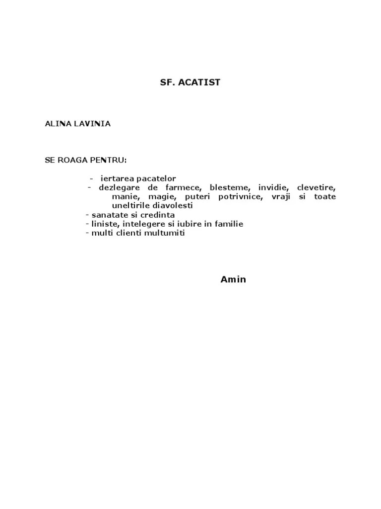 In numele tatalui si al fiului si al sfantului duh.. Dumnezeule, ascultă rugăciunea mea, pleacă urechea ta la graiurile gurii mele. I n numele tatalui si al fiului si al sfantului duh, amin. In numele tatalui si al fiului si al sfantului duh. Sep 20, 2020 · acatist pentru linistirea sufletului. Iisuse, linistea celor tulburati, 8. Iisuse, linistea puterii tale dumnezeiesti, ce mult ai suferit pentru noi, 10. Iisuse, linistea copiilor nostri, 7. S lava tie, dumnezeul nostru, slava tie! Acatist pentru liniştirea sufletului, akathist, soothe the soul. Acatistul maicii domnului, povăţuitoarea copiilor.. Mult timp am căutat această rugăciune… acatist pentru linistirea sufletului.