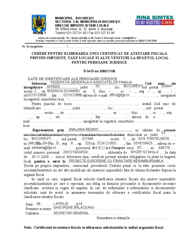 Primăria sector 1 bucurești vă prelucrează datele personale în baza reglementărilor legale aplicabile în domeniul specific de activitate.. Registrul furnizorilor acreditați de servicii de certificare pentru semnătura electronică. 1 (anexa nr.2 la ordinul nr.752/2006) cerere de eliberare a certificatului de atestare fiscală a.registrul furnizorilor acreditați de servicii de certificare pentru semnătura electronică. 23/07/2019 · primăria sectorului 1 reduce birocrația în ceea ce privește eliberarea certificatelor de atestare fiscală. Prezenta procedura reglementeaza modalitatea de obtinere a certificatului fiscal aferent persoanelor fizice in cadrul directiei generala impozite si taxe locale sector 3.. În cazul în care nu doriţi ca anumite date personale să fie dezvăluite, aveţi posibilitatea de a vă exercita dreptul de opoziţie, în condiţiile prevăzute de art.