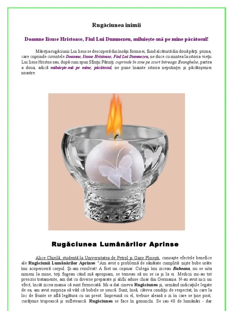 16.08.2017 · la final, vei rosti din nou rugăciunea lumânărilor aprinse. Eu va spun ca rugaciunea lumanarilor aprinse este cel mai bun medicament. Toti cei care fac asta trebuie sa aiba credinta si sa participe la cat mai multe sfinte masluri... Textul rugaciunii celor 33 de lumanări aprinse