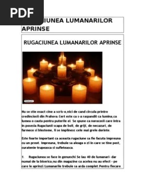 16.08.2017 · la final, vei rosti din nou rugăciunea lumânărilor aprinse. Ritualul se poate face si fara preot, … Apoi iarasi, o singura data, se spune rugaciunea lumanarilor aprinse. Ritualul se poate face si fara preot, …21.11.2020 · după ce lumânările au ars, spuneți o singură dată rugăciunea lumânărilor aprinse.