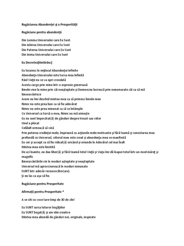 Posted on 2 iulie 2013 by filipdaniel.. Eu sunt sursa tuturor bogăţiilor eu sunt bogat(ă) şi am idei creative mintea mea abundă de gânduri noi, originale, inspirate ceea ce am de oferit este unic şi lumea o doreşte valoarea mea este. Rugaciune pentru spor eu … (prenumele) sunt magnetul care atrage prosperitate si abundenta, iubire si armonie, sunt in echilibru si armonie cu legile divine. 19.10.2021 · rugaciune pentru prosperitate rugăciune pentru prosperitate. Afirmaţii pentru prosperitate.a se citi cu voce tare timp de 30 de zile! A se citi cu voce tare timp de 30 de zile!. Eu sunt sursa tuturor bogăţiilor eu sunt bogat(ă) şi am idei creative mintea mea abundă de gânduri noi, originale, inspirate ceea ce am de oferit este unic şi lumea o doreşte valoarea mea este infinită ceea ce …